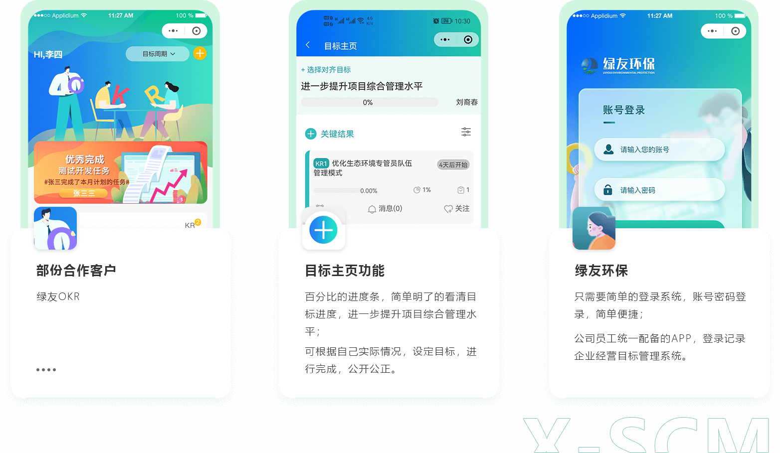 “綠友環保OKR”是我們X-SCM的優秀合作(zuò)之一(yī),OKR能(néng)使員工與企業目标保持一(yī)緻并緊密聯系起來,給每個團隊和個人(rén)明确的方向,通過專注于目标來提高生(shēng)産力,跟蹤實現目标的常規進度!并且PC端與手機端,都可實現完成,共通使用,跟蹤實現目标的常規進度,做出更有效,更明智的決定,實現衡量,問責制和透明度。